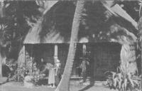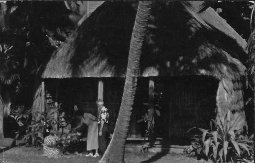 Tourists visiting Hulihee Palace grass house, Kailua, Hawaii Island. |