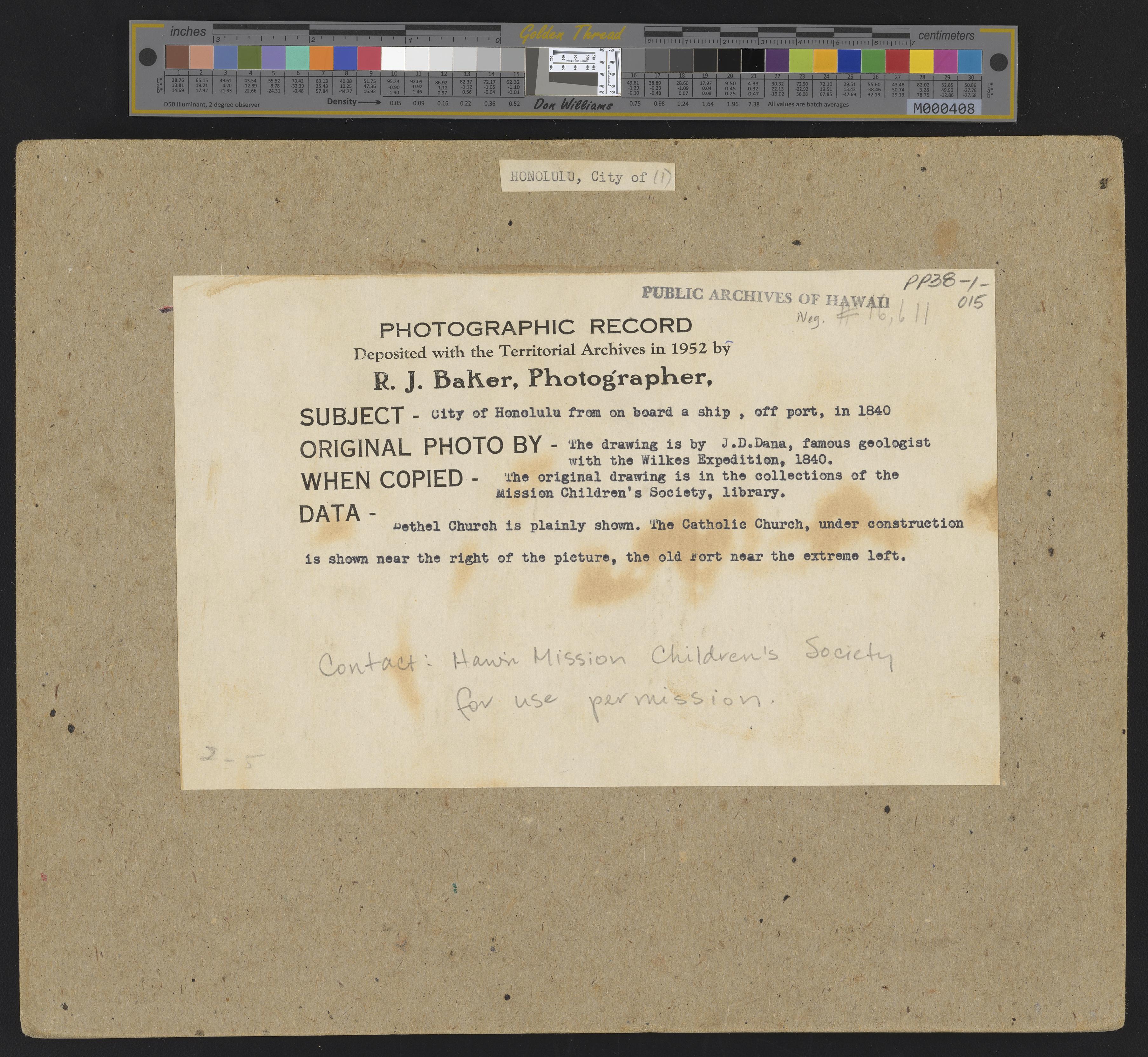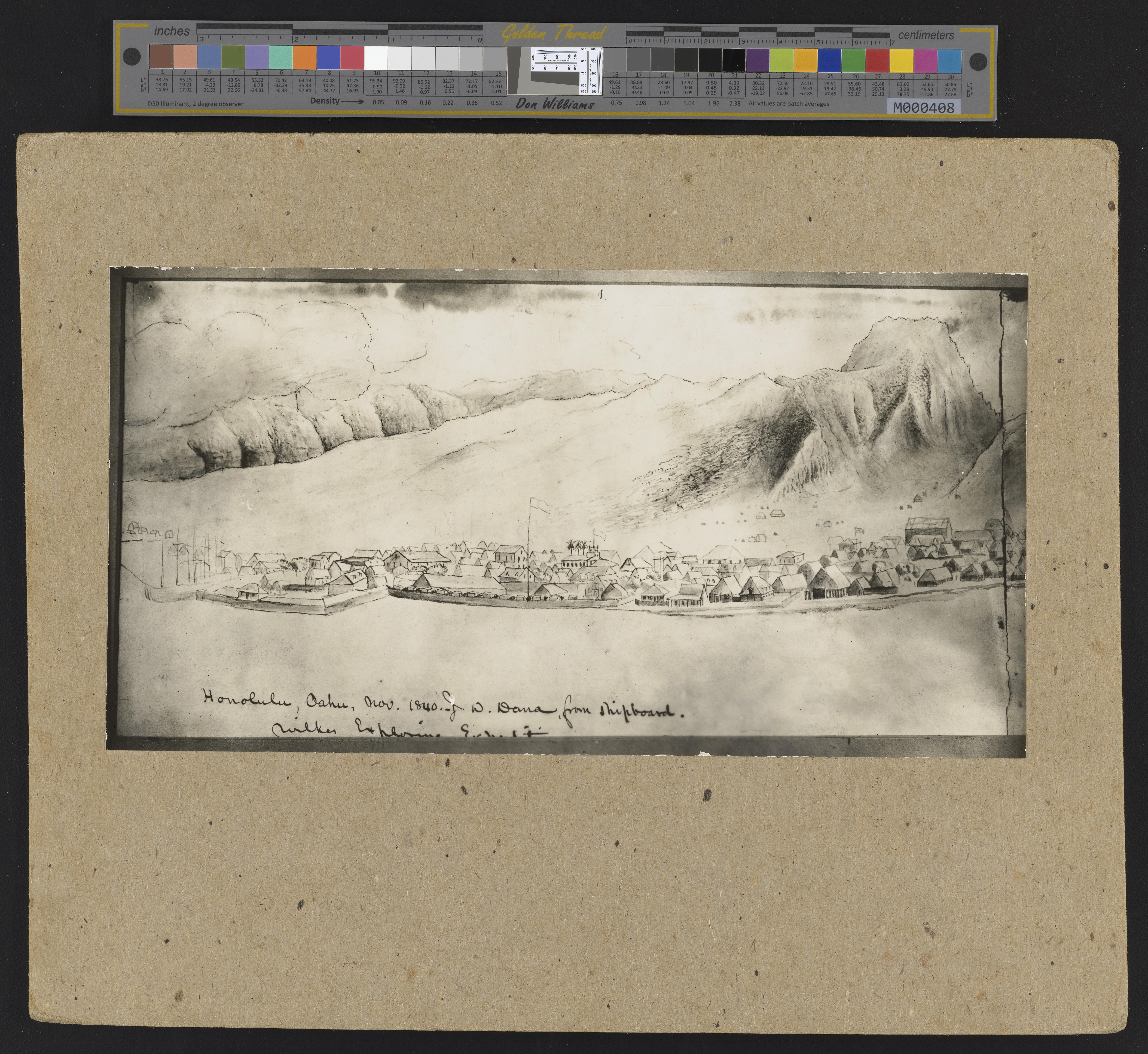 Subject - City of Honolulu from on board a ship, off port, in 1840. Original Photo by - The drawing is by J. D. Dana, famous geologist with the Wilkes Expedition, 1840. The original drawing is in the collections of the Mission Children' s Society Library. Data - Bethel Church is plainly shown. The Catholic Church, under construction is shown hear the right of the picture, the old Fort near the extreme left.; Contact Hawaiian Mission Children's Society for use permission; [from the front]: Honolulu, Oahu, Nov. 1840. J. D. Dana from shipboard. [ . . .].