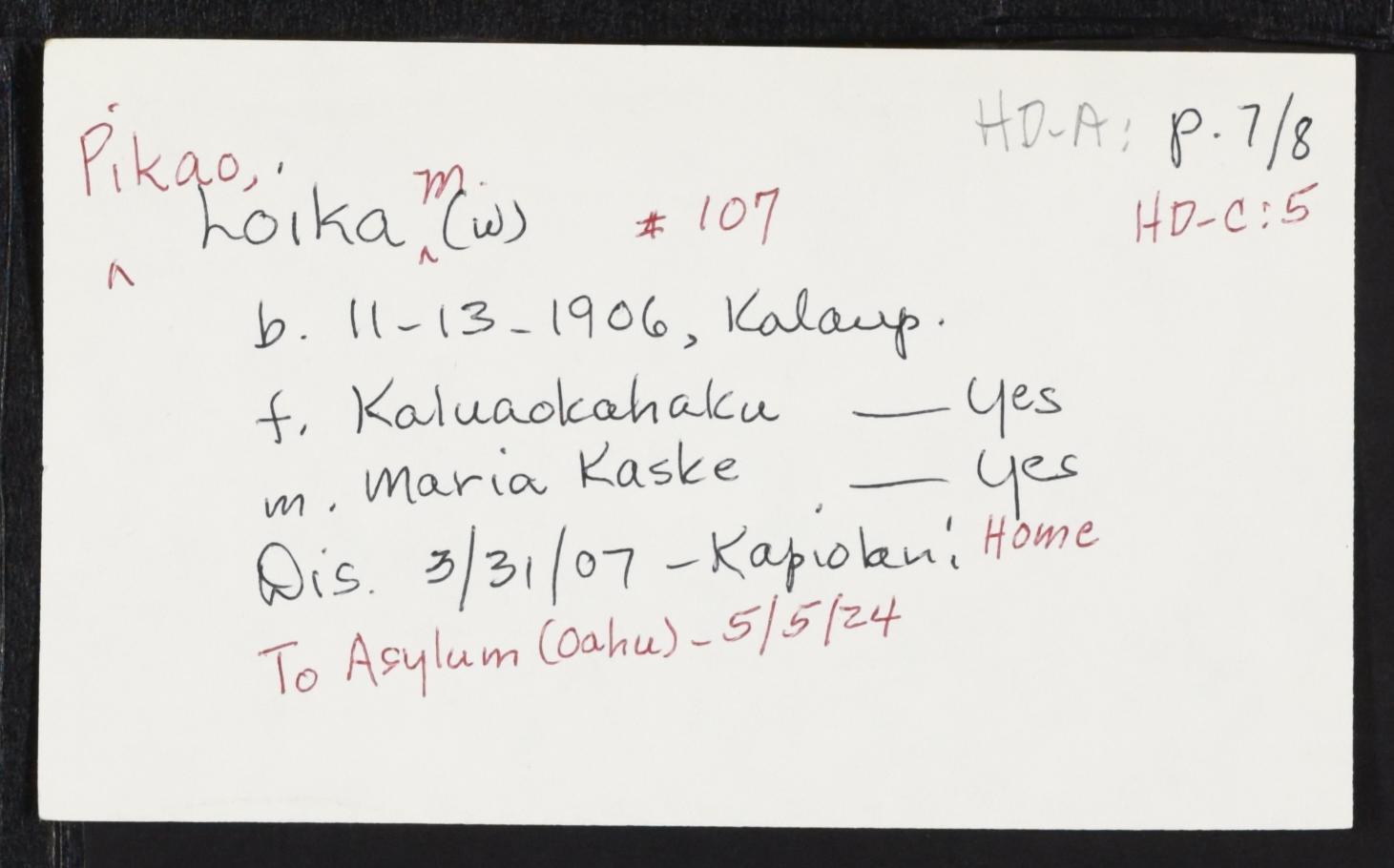 Kalaupapa Birth Record "Loika Pikao" |