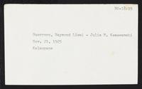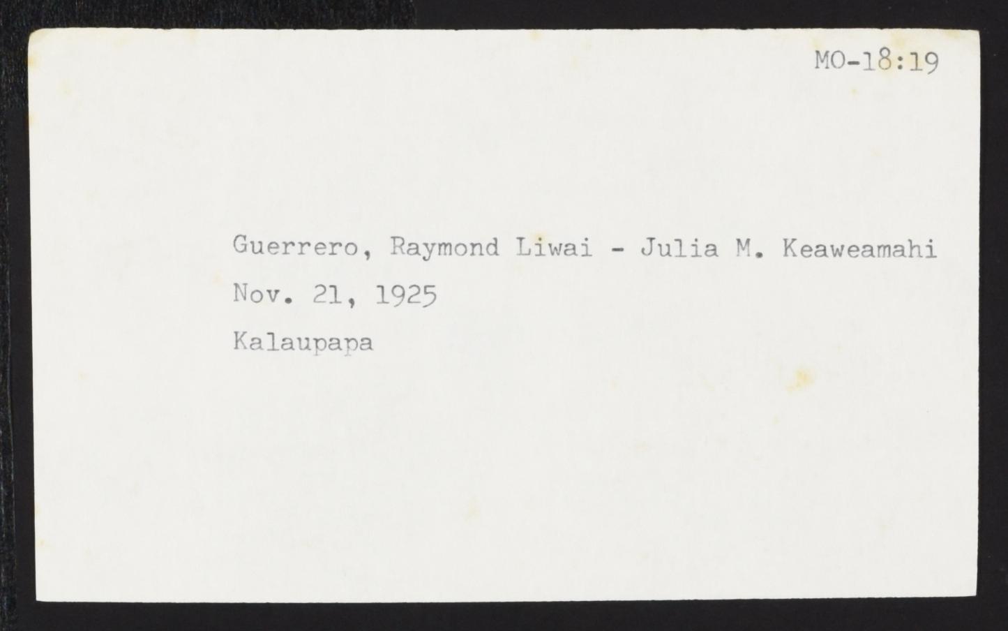 Kalaupapa Marriage Record "Julia M Keaweamahi and Raymond Liwai Guerrero" |