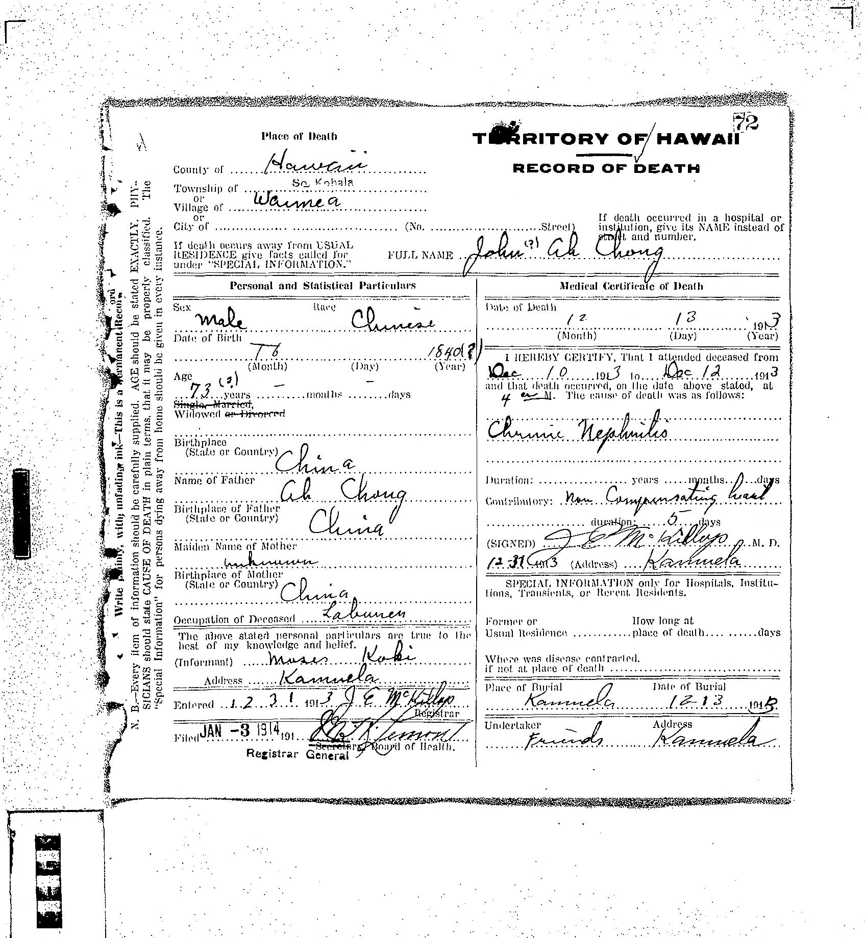 John Ah Chong - Death Record - 1913 Dec 13 |