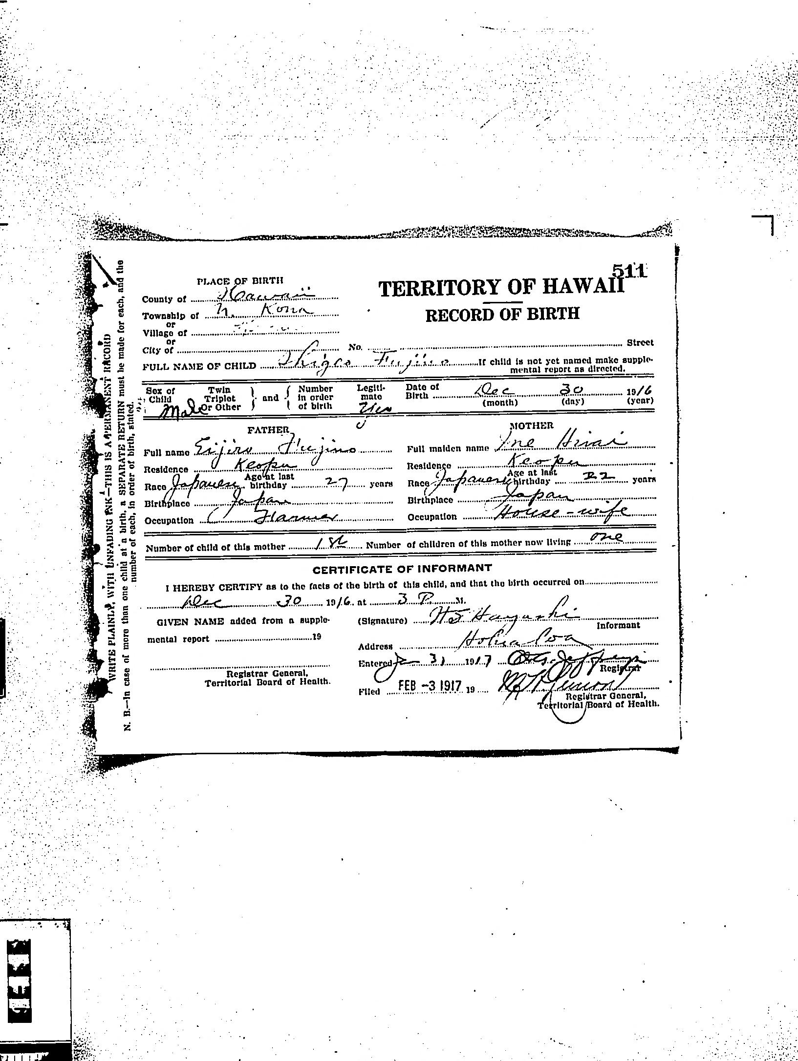 Shigeo Hujino - Birth Record - 1916 Dec 30 |