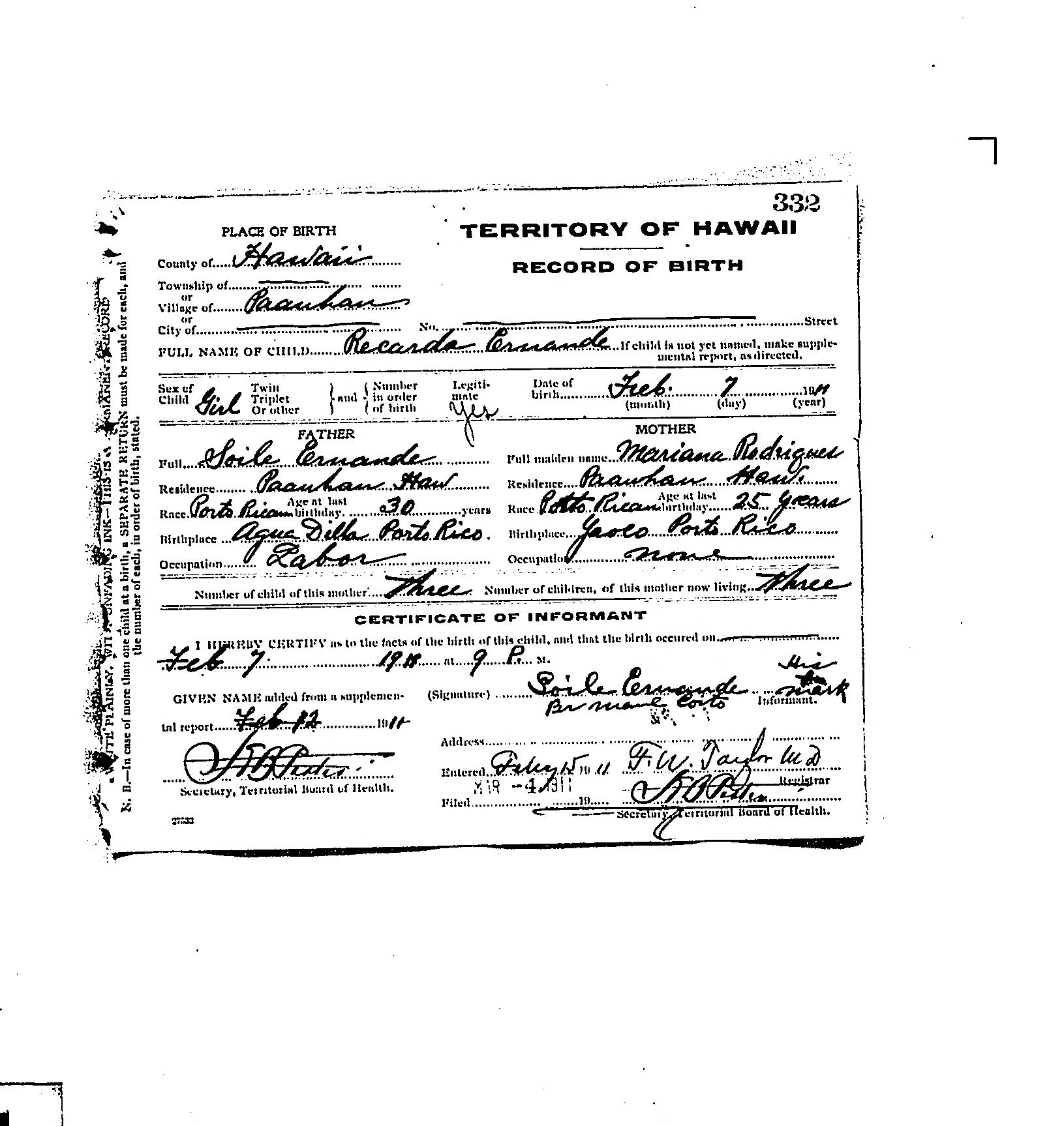 Recarda Ernande - Birth Record - 1911 Feb 7 |