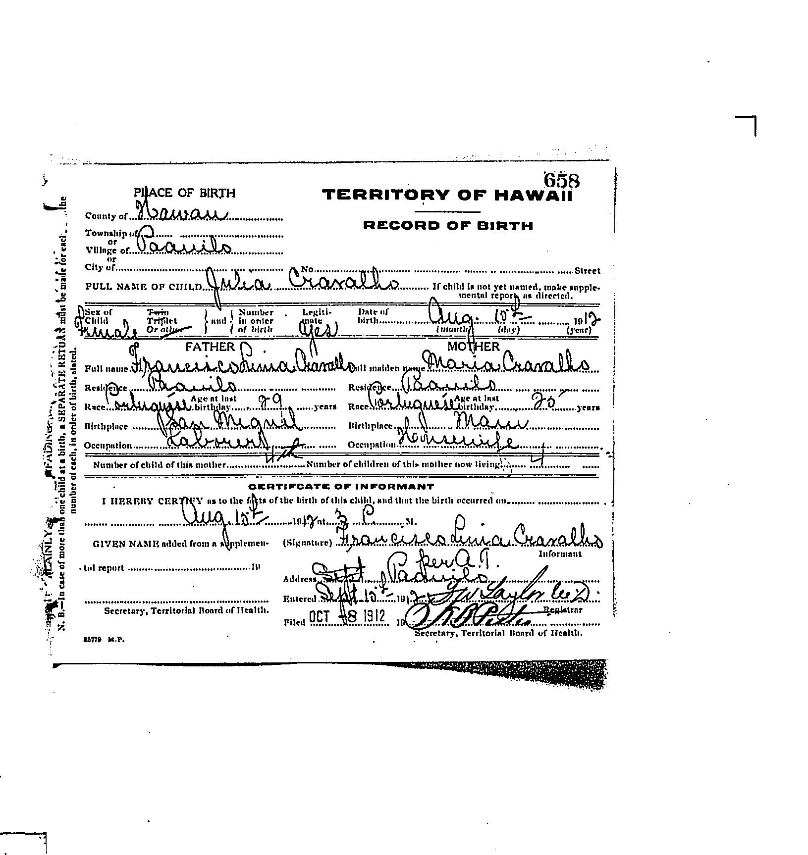 Julia Cravalho - Birth Record - 1912 Aug 10 |