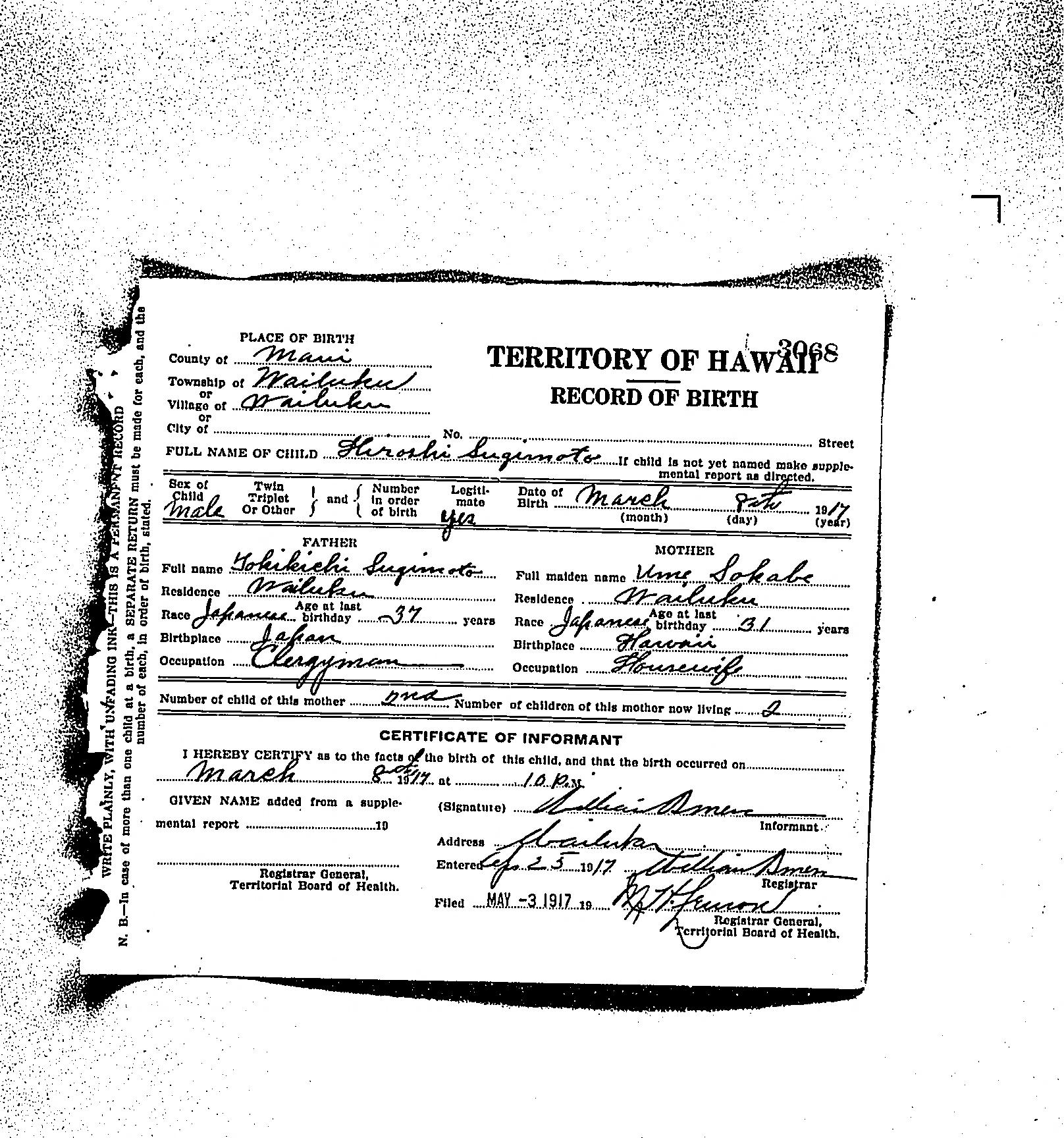 Hiroshi Sugimoto - Birth Record - 1917 Mar 8 |